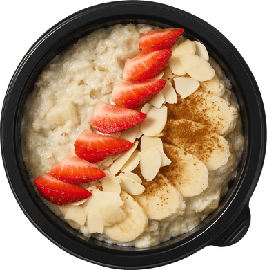 Мы готовим кашу из двух видов хлопьев различной степени мягкости и овсяных отрубей. Благодаря такому «коктейлю» у каши получается особенная, объемная текстура, не слишком плотная, но и не размазня. Бананы и клубнику, которые мы добавляем в кашу, не проходят термическую обработку. Это позволяет сохранить их вкус и пользу.
