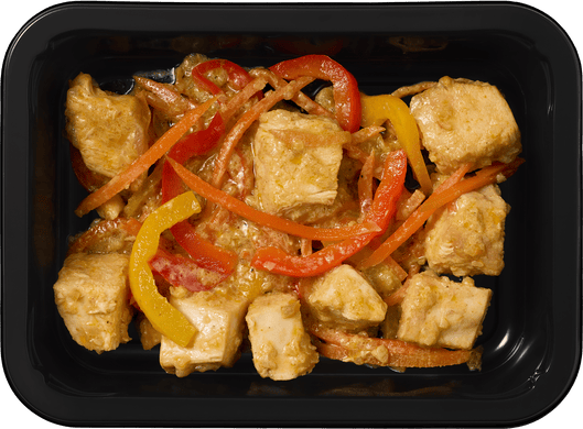 Курица, обжаренная до румяной корочки, в насыщенном соусе на кокосовом молоке с пастой карри, имбирём и овощами. Ароматное блюдо в азиатском стиле, с лёгкой пряностью.