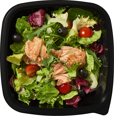 Копчёный лосось, черри*, микс салатных листьев "Тоскана", свежий огурец, маслины*, руккола*.