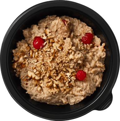 Мультизерновая каша на миндальном молоке — с овсяными хлопьями, отрубями и сушёной вишней. Сверху — рубленый орех пекан.