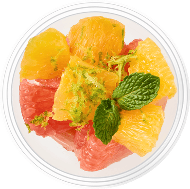 Фруктовый салат из цитрусовых - апельсина и красного грейпфрута с добавлением цедры лайма.