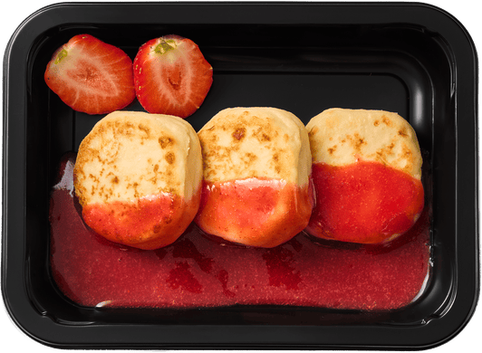 Традиционные сырники, в которых мы используем минимум муки и сахара. В качестве соусов подаются протертые ягоды - клубника, черника, ягодный микс, или сметана. При необходимости мы можем приготовить сырники на рисовой муке (без глютена), без сахара, а также запечь их без обжарки.
