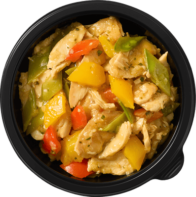 Куриное филе, болгарский перец, апельсин, кенийский горох*, лук шаллот, устричный соус*, чеснок*, оливковое масло, кинза*, картофельный крахмал, тимьян*, розмарин*.