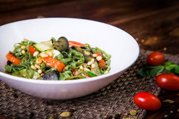Феттучине ширатаки, печеный болгарский перец, черри, цуккини, баклажан, оливковое масло, орех кедровый, базилик, лимон, соль.