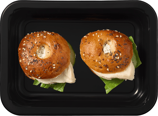 Мы печем бейглы из цельнозерновой муки на собственном производстве. В качестве начинки мы используем филе фермерской куриной грудки, огурцы, салат и легкий творожный сыр.