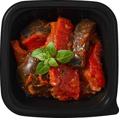 Баклажан, печеный болгарский перец, томаты, оливковое масло, уксус, ки нза*, соль*, чеснок, чёрный перец*.