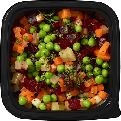 Свекла, морковь*, батат, свежий огурец*, соленые огурцы*, зелёный горошек*, желатин, укроп.
