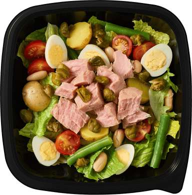 Черри*, мини-картофель, тунец конфи, перепелиное яйцо*, белая фасоль*, кенийская фасоль, салат романо, каперсы*.