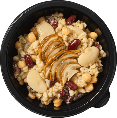 Тёплый микс из нескольких видов фасоли, полбы и перловки с пастой из белых грибов.
