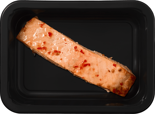 Стейк лосося, запечённый в пряном соусе чили. Рыба остаётся сочной, а соус добавляет пикантность.
