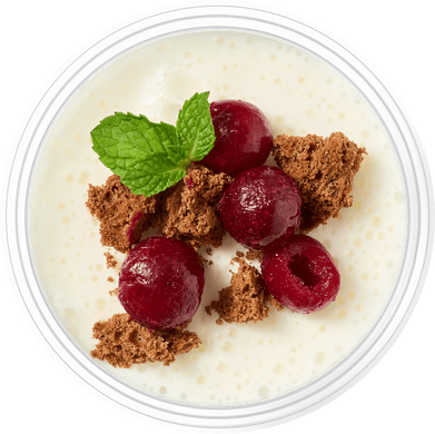 Сливки, вишня, вишневый сок, греческий йогурт 4% жирности, яйцо, горький шоколад, пшеничная мука, сливочное масло, сахар, ром темный, ванильный сахар, эритрит, жел атин.
