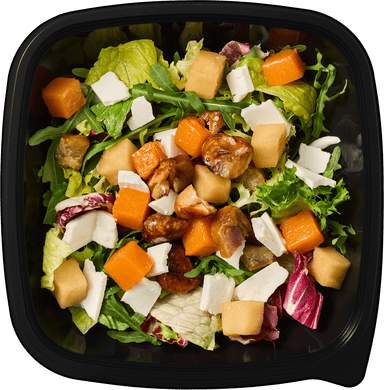 Каштаны, микс салатных листьев "Тоскана", сыр адыгейский козий*, руккола, оливковое масло.