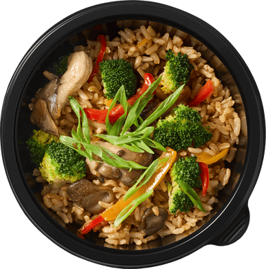 Органический коричневый рис, болгарский перец, брокколи*, вешенки, лук шаллот, соевый соус, кунжутное масло, чеснок, зеленый лук*.