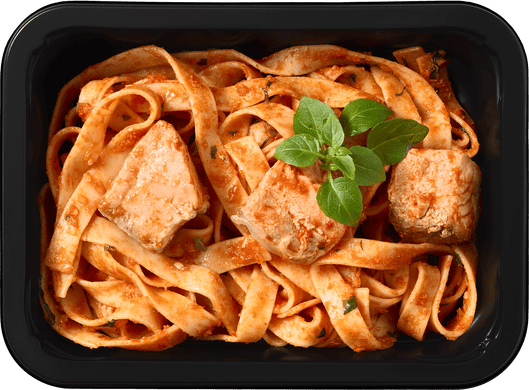 Феттучине, свежие томаты, филе лосося, лук шаллот, оливковое масло, базилик, чеснок*, соль*, чёрный перец*.