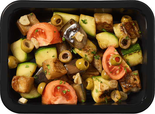 Крупные кубики баклажанов и цуккини обжарены с чесноком, оливками и каперсами, дополнены томатами без кожицы. Запекаем в духовке до мягкости. Сочный гарнир с насыщенным вкусом.