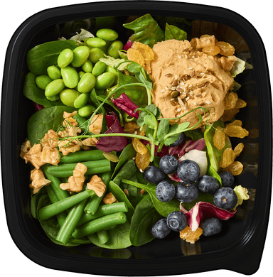 Основная идея боула — сочетать в одной тарелке разные вкусы, текстуры и нутриенты. В этом боуле собраны хумус, эдамамэ, кенийская фасоль, изюм, свежие салатные листья, семена и ягоды голубики. Сытное, сбалансированное блюдо, богатое клетчаткой, белком и полезными жирами.