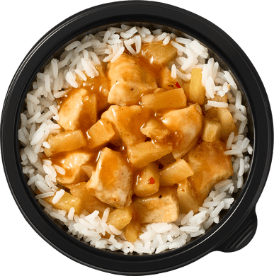 Рис "жасмин", куриное филе, ананас*, ананасовый сок, сладкий соус чили, арахисовое масло, рисовый уксус, томаты, мирин, соль*, соевый соус, сычуанский перец, кайенский перец.