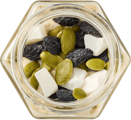 Кокосовое молоко, зерновые хлопья, киноа, кокос сушеный*, семена чиа, изюм*, семена тыквы*, мёд.