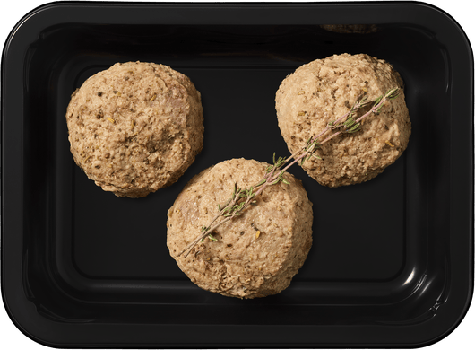 Постная говядина, репчатый лук, безлактозное молоко, яйцо, хлеб, соль*, тимьян*, чёрный перец.