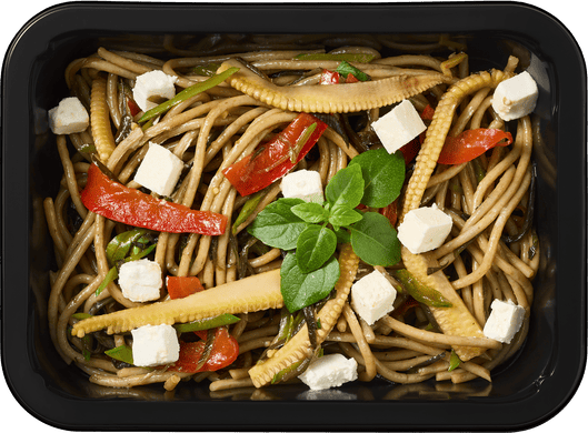 Спагетти из киноа, кенийский горох*, кожа баклажана*, болгарский перец, сыр фета, мини-кукуруза*, устричный соус*, овощной бульон, оливковое масло, базилик.