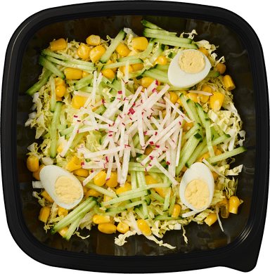 Свежий огурец, китайска я капуста, зёрна кукурузы*, красный редис*, перепелиное яйцо.