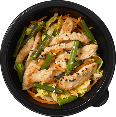 Филе индейки, китайская капуста, зеленая фасоль, морковь, соевый соус, черный кунжут*, кукурузный крахмал, зеленый лук*, кунжутное масло, устричный соус, вустерский соус.