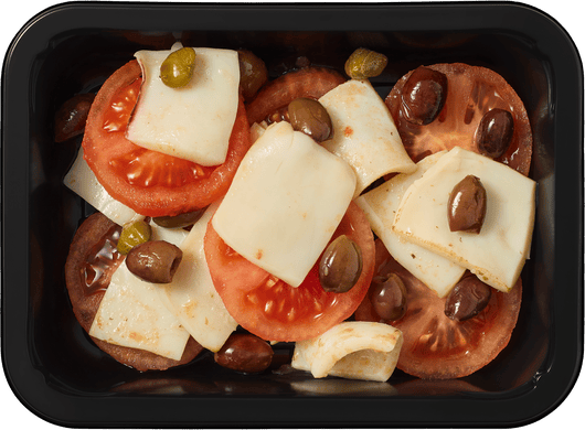 Кальмар, помидоры, оливки таджаски*, каперсы*, оливковое масло, соль.