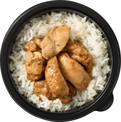 Куриное филе, рис "жасмин", соевый соус, мирин, арахисовое масло, кукурузный крахмал, сычуанский перец, апельсиновая цедра, лимон, корень имбиря, соль*, чеснок, перец чили.