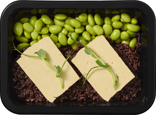 Черный рис, сыр тофу, бобы эдамамэ, киноа, соевый соус*, оливковое масло, соль*.
