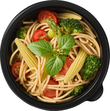 Цельнозерновые спагетти, капуста романеско*, черри*, спаржа*, мини-кукуруза*, лимон, оливковое масло, цедра лимона*, соль*, чёрный перец*.