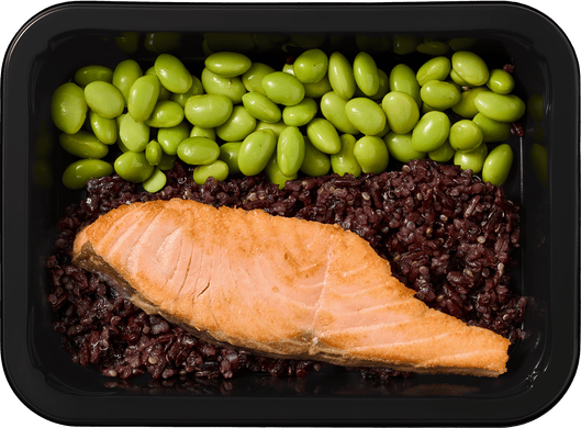 Черный рис, филе лосося, бобы эдамамэ, киноа, оливковое масло.