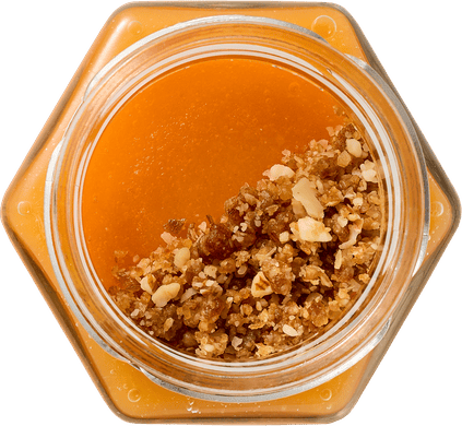 Яблоко "гренни смит" , тыква, сушеные финики*, овсяные хлопья, грецкие орехи*, желатин, миндаль*, сироп из фиников, ванильный экстракт, корица.