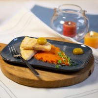 Филе судака, батат, фенхель, лук порей*, рыбный бульон, пшеничная мука, сливочное масло, микрозелень*, соль*, желатин, перец белый*, куркума, кардамон молотый, мускатный орех, шафран.