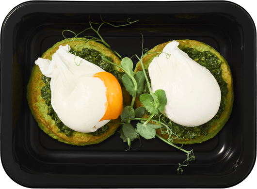 Альтернатива классической подаче яиц-пашот. Галеты из зеленого горошка не только заменяют хлеб, но и придают блюду насыщенный яркий вкус. Подаются с заправкой из пряных трав и микрозеленью.
