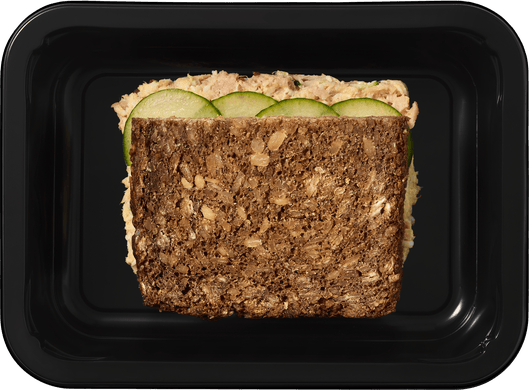 Цельнозерновой хлеб, яйцо, тунец конфи, свежий огурец*, легкий майонез.