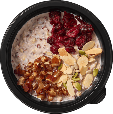 Эта каша имеет сладко-соленый вкус и плотную текстуру. Она приготовлена без сахара, на безлактозном молоке. Естественным подсластителем служат служат сушеные финики и клюква. Каша дополнена миксом из орехов и семян.