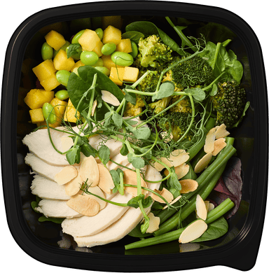 Куриное филе, манго, брокколи*, кенийская фасоль*, бобы эдамамэ, мини-шпинат*, мангольд, проростки зеленого гороха*, руккола*, миндальные лепестки*, тимьян*, розмарин*.