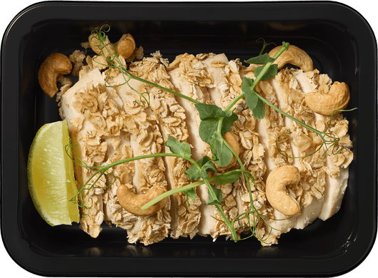 Стейк из фермерской куриной грудки, запеченный в овсяных хлопьях без глютена. Подается с лаймом, проростками гороха, орехами кешью и миндальными лепестками.
