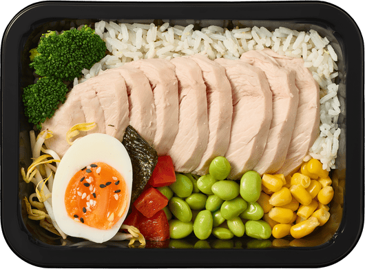Филе индейки, рис "жасмин", яйцо*, брокколи*, болгарский перец, бобы эдамамэ, пророщенная соя*, зёрна кукурузы*, растительное масло, нори*, соль*, белый кунжут*, чеснок*, имбирь*, розмарин*.