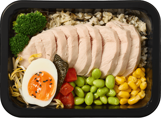 Филе индейки, микс из бурого и дикого риса, яйцо*, брокколи*, болгарский перец, бобы эдамамэ, пророщенная соя*, зёрна кукурузы*, нори*, белый кунжут*, чеснок*, имбирь*, розмарин*.