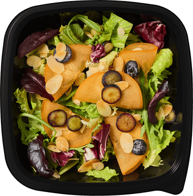 Хурма, микс салатных листьев "Тоскана", голубика, сливки, сыр горгонзола, творожный сыр, руккола, мангольд, миндальные лепестки*.