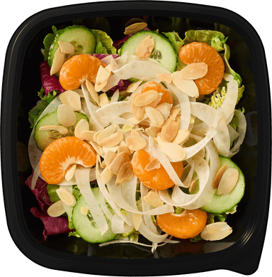 Мандарины, микс салатных листьев "Тоскана", свежий огурец, фенхель, миндальные лепестки*.