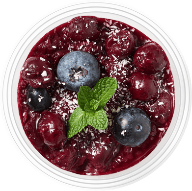 Кокосовое молоко, малина, вишня, голубика*, агар-агар, красное сухое вино, эритрит, кокосовая стружка, мята*.