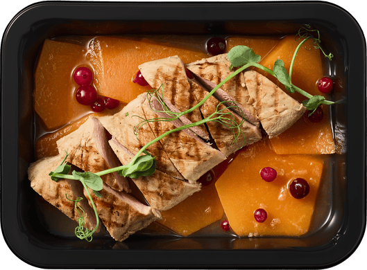 Филе утки маринуется в смеси соевого соуса, имбиря, шалота и чили, а затем слегка обжаривается на гриле. Подаётся с нежной тыквой и пряным клюквенно-имбирным соусом.