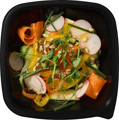 Свежий огурец, морковь*, цуккини, болгарский перец, к расный редис*, микс салатных листьев "Тоскана", проростки зеленого гороха*, лук себулет*.