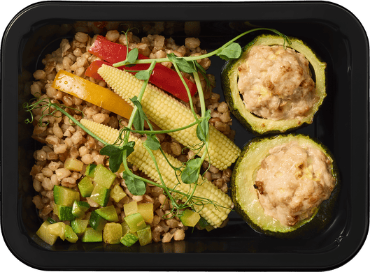 Кольца запечённых цуккини с начинкой из фарша индейки. Итальянская полба с добавлением болгарского перца и мини-кукурузы.