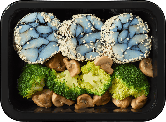 Филе судака, брокколи, шампиньоны*, белый кунжут*, растительное масло, соль*, чернила каракатицы, черный перец*.
