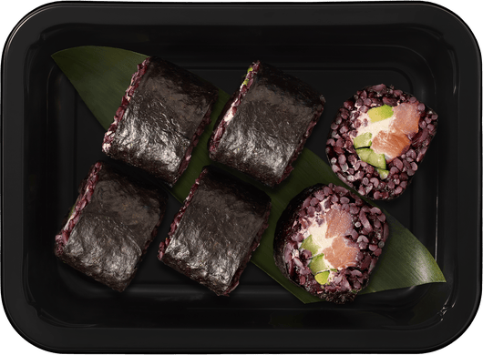 Черный рис, лосось слабой соли, свежий огурец, рисовый уксус, авокадо, творожный сыр, нори.