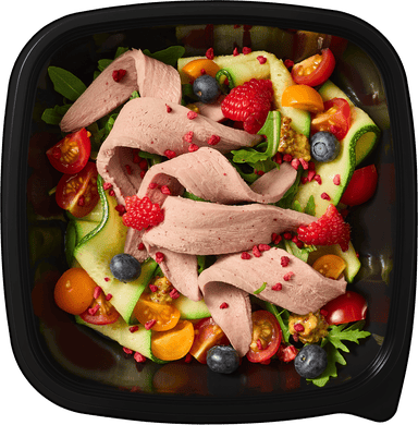 Изысканный салат в духе современной европейской кухни. Нежная утиная грудка, запечённые цуккини и свежие лесные ягоды создают гармоничный баланс сладости, пряностей и белка. Полезный и эстетичный вариант для лёгкого перекуса.