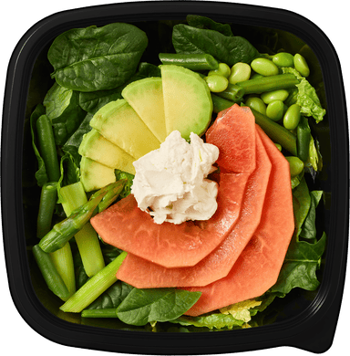 Папайя, бобы эдамамэ, салат романо, спаржа свежая*, творожный сыр, авокадо, кенийская фасоль*, мини-шпинат*, сливки, сок лайма.